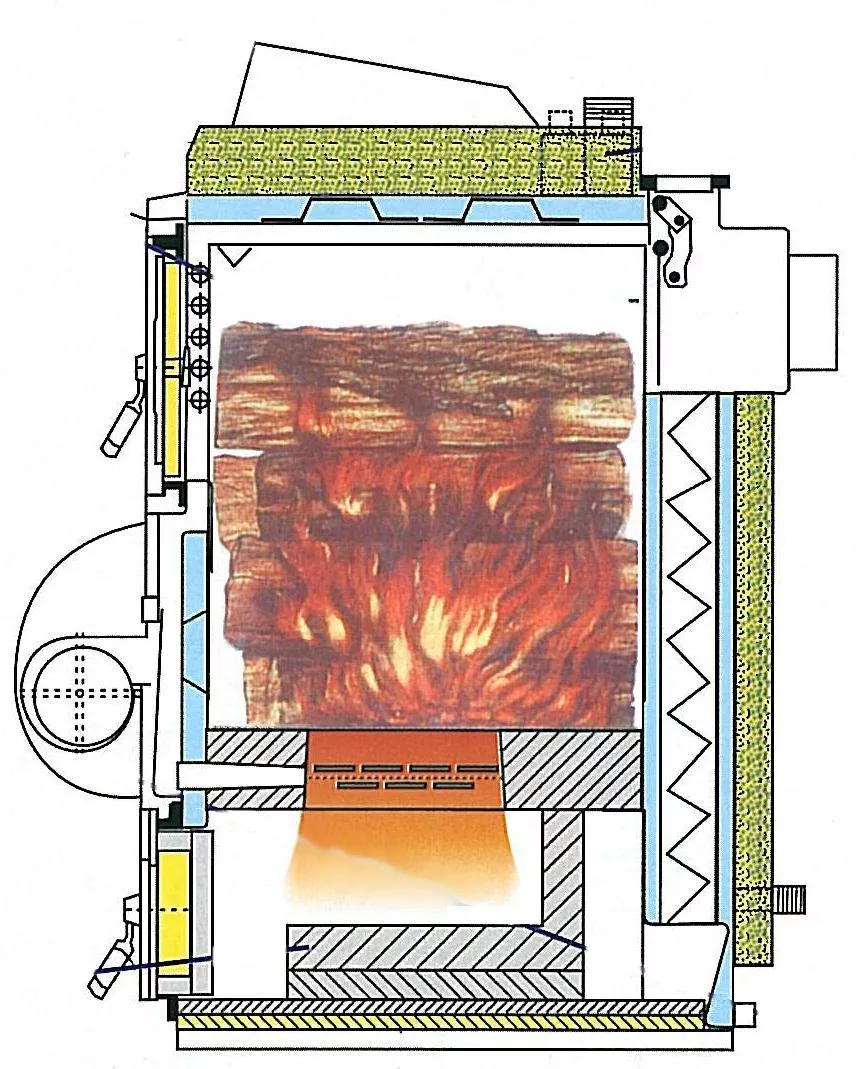 Primární i sekundární vzduch vháněný radiálním ventilátorem je předehříván ve zdvojených částech pláště kotle a přiváděn v optimálním mísícím poměru do spalovací trysky. Masívní dohořívací keramická tvarovka udržuje vysokou teplotu pro dohoření dřevoplynu. Svislá trubkovnice doplněná brzdiči spalin zabezpečuje maximální předání energie a nízkou teplotu spalin na výstupu z kotle.